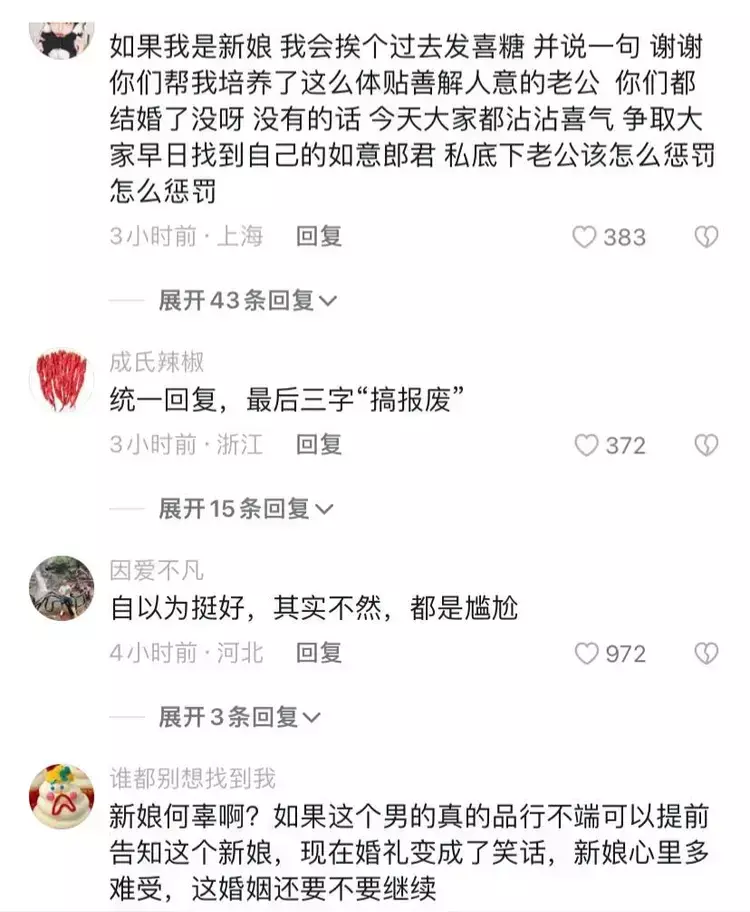 有网友表示,真的羡慕这个新郎,婚前感情经历丰富,各种口味都品尝过了,可以说是男人的骄傲。